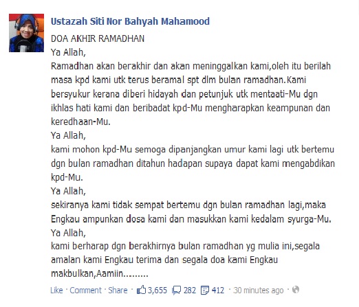 Sebak rasanya, ramadhan akan pergi...hanya tinggal sehari sebelum aidilfitri tiba......na dapat doa ni dari FB na: